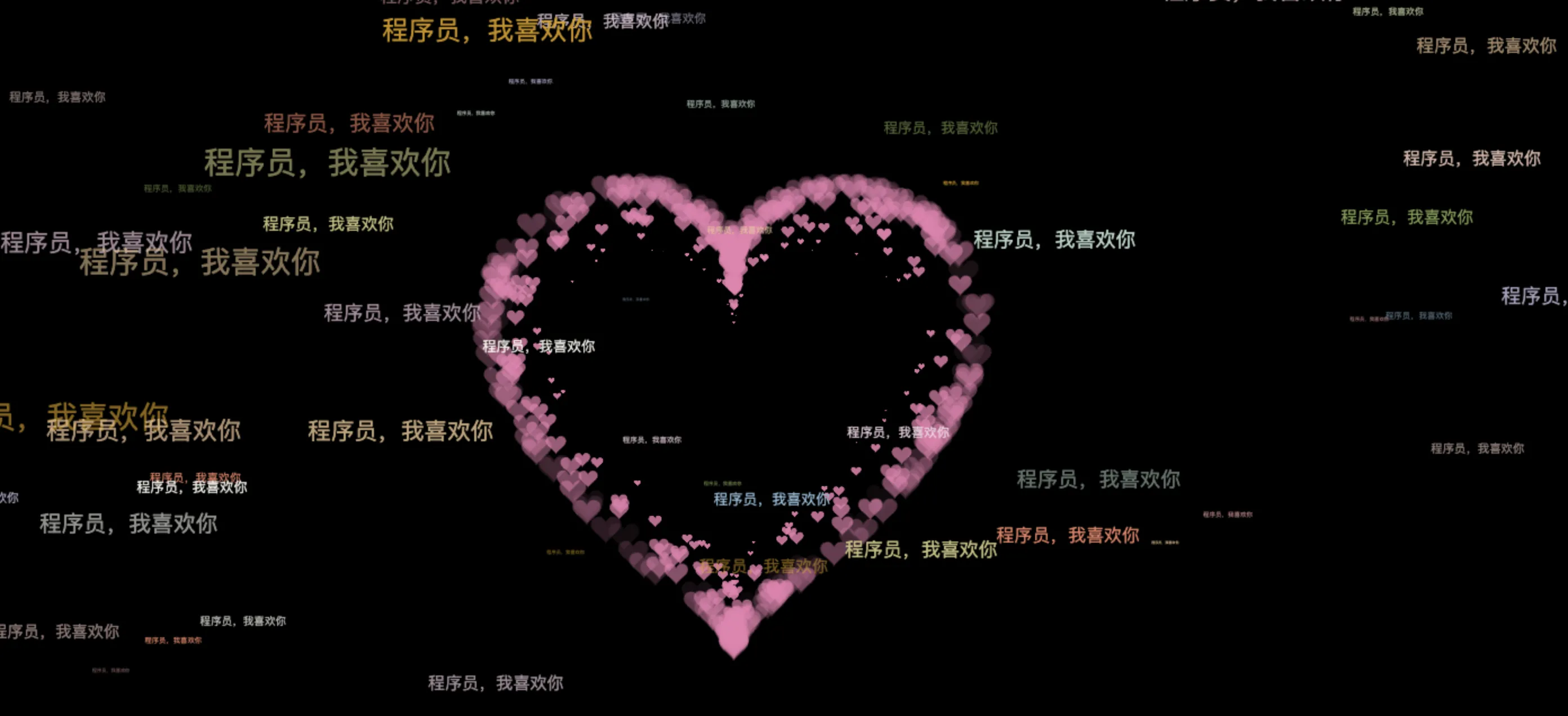 该文本是一个完整的HTML文档,展示了一个动态的心形动画效果。使用CSS进行样式设置,JavaScript用于创建和管理动画,显示了程序员的爱意。页面背景为黑色,心形图案通过画布元素绘制,并伴随颜色变化和动画效果,营造出浪漫的氛围。